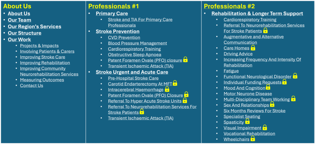 Our website contains a large amount of information mostly aimed at professionals with some pages more patient/public facing. To help users understand what is available, we have devised an interactive infographic with embedded hyperlinks to support navigation around the different sections.