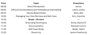 The morning session was aimed at inpatient services, with community staff attending after lunch. The training covered a range of topics, with delegates also reviewing previous ACT training delivered last year. We will be evaluating attendees before and after understanding of ACT, as well as following up on how they put the training into practice when supporting patients and their carers.