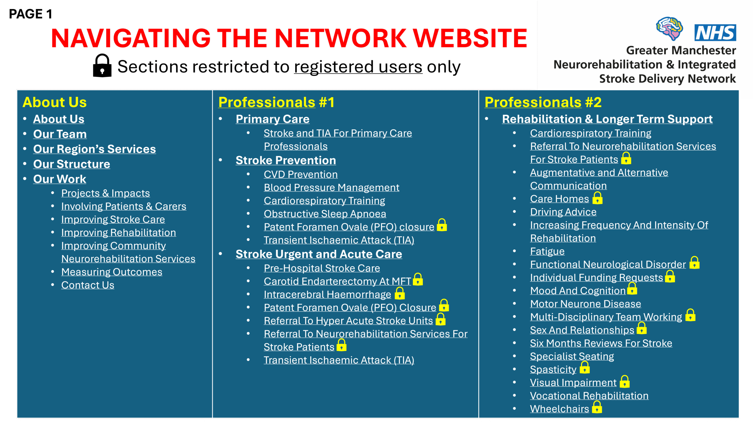 Some sections (denoted by a padlock) are restricted to registered users who have then logged in. We only grant registration to professionals from the public sector (i.e. NHS, local authority etc), voluntary sector and academia who sign up using their professional email address.