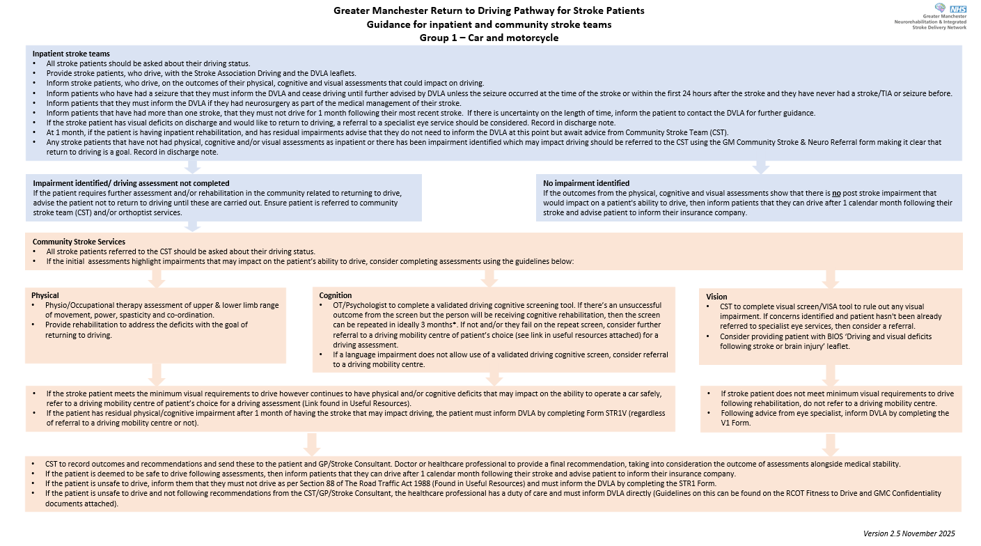 Please note that, Large Goods Vehicle (LGV) and Passenger Carrying Vehicle (PCV) licences are categorised under Group 2 by the DVLA and therefore stroke and TIA patients with these licences should follow the Group 2 pathway.